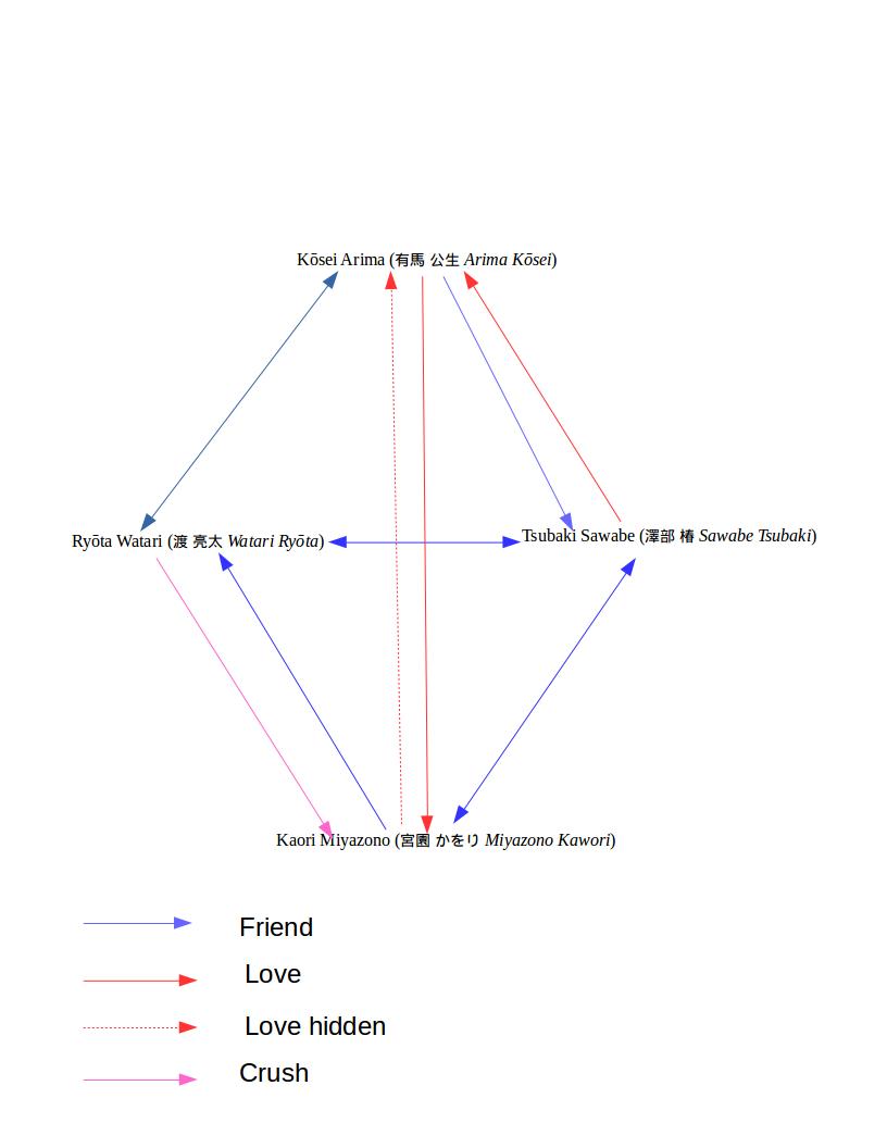 A little boy, Kosei Arima, a natural prodigy at the piano, is savagely beat and abused by his own mother into becoming a piano superstar at 5, winning all competitions, and losing his soul. This anime is unbelievable in its depth psychology as we plumb deep into that tortured heart of darkness inside Kosei, and how he comes to be saved by his precious friends; the MC chart above lays out some of these detailed connections of human depth and support.