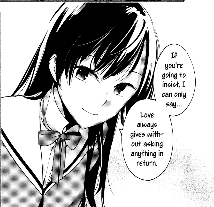 Touko Nanami (七海 燈子) to Yuu Koito (小糸 侑) from the manga, “Bloom into You” by Nakatani Nio, Chapter 8, Page 18. This is a Yuri manga, but the story is about love. The unity of the pair bond is only the beginning of a much larger human movement towards unity, co-operation, working together, helping each other, the Good Samaritan story. If one sees self in the other, then any self-sacrifice for another is unitary, and ends in some ultimate fashion as the betterment of the common good to which the lover belongs.